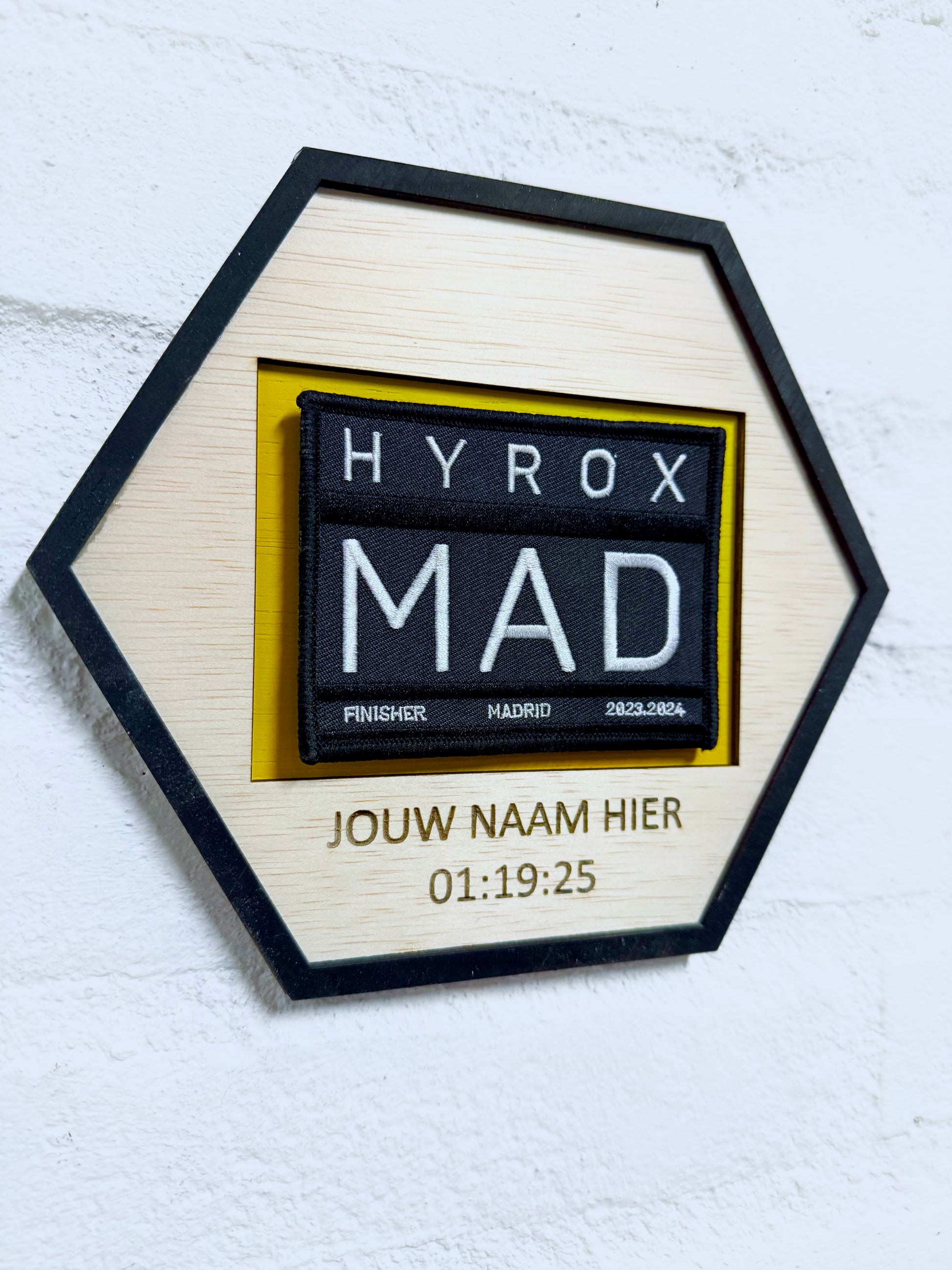 Of je nu een Finisher badge, Pro patch, of stadspatch van je HYROX avontuur hebt – met dit HYROX muurdisplay geef je jouw sportmomenten een blijvende plek.